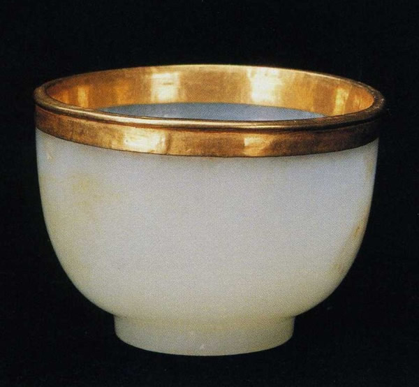 本品は、9歳で亡くなった貴族の娘(李静訓)の墓から発見された約200点の副葬品の一部。玉製品はすでに新石器時代から制作された長い伝統をもつ。隋唐時代においても玉器は引き続き珍重されたが、隋唐の玉器にあっては、白色の玉が用いられる場合が多い。この作品は、一部に黄土色の斑を含む白玉をていねいに研磨して成形したうえ、口縁に金の覆輪をつけた、たいへん贅沢な作りとなっている。覆輪は、金のほかに銀、錫、銅といった材質が使用され、欠けやすい口縁を保護したり、口あたりをまろやかにし、また水切れをよくするなど、いくつかの効能をもつものとして後代の器にしばしば用いられた。この作品は、その最も早い時期の作例に属し、"金製宝珠首飾"、"金杯"と同じく、以後の中国工芸品の先駆として重要な位置をしめる。白磁製品とも共通した端正な姿は、当時の見事な造形力をよく示している。