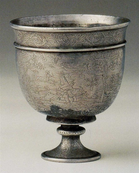 西安市東郊の沙坡村から発見された15点の唐代銀器の一つで、当時愛好されていた酒杯の一種である。口縁と胴下部に蓮唐草文がめぐり、胴の中央には、騎馬人物が鹿や兎・狐あるいは雁を追いながら弓矢を射るなどという狩猟の場面が四方に展開され、脚部に対葉花文が表現される。地の全面には、微細な小円文からなる魚々子が密に刻出されている。西方に源を発する文様を巧みにアレンジして、唐ならではの作品に仕立てており、そこには、進取の気風と国際色に富んだ唐文化の特色が端的に現われている。唐時代盛期の銀器の典型的な作風を随所に示しか佳品といえよう。なお、この種の器では表面の文様部に鍍金(金メッキ)を施すことがしばしばあるが、この作品では鍍金の痕跡は定かでない。出所:『悠久の美-中国国家博物館名品展』