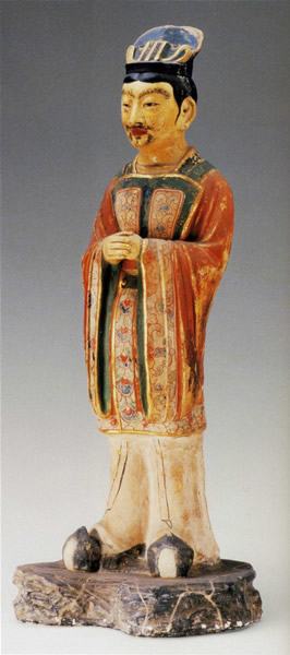 文官俑と武官俑は、鄭仁泰の墓から発見された一対の俑である。鄭仁泰は、唐王朝を建国した高祖(李淵)をはじめ、第2代太宗(李世民)、第3代高宗(李治)という3代にわたって唐王朝に仕え、多大な功績を残した唐時代初期の重臣の1人で、死後の麟徳元年(664)に太宗の陵墓である昭陵に陪葬された。この一対の俑は、穏やかな表情をしてたたずむ文官と、わずかに腰をひねって両手に何かをもって立つ武官というように、文武の対比をあざやかに示す。型によって成形した後、黄色の釉薬を施したうえに、彩色と金箔によって仕上げを施すという、当時最新の技法が用いられている。
