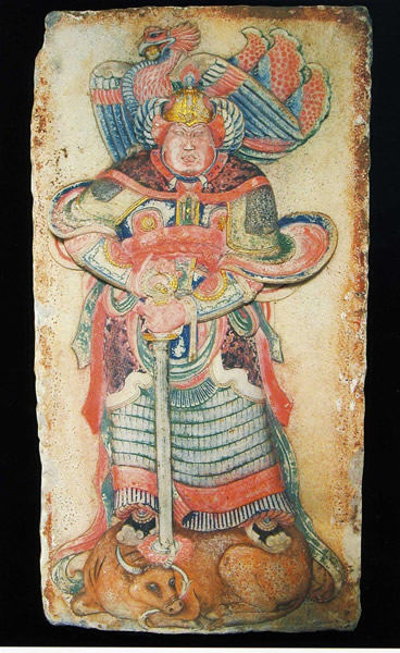 唐王朝の力が衰えた9世紀終わり頃から次の五代にかけては、1世紀近くにわたって各地の軍閥が覇を競った混乱期が続いた。この作品が発見された墓は、唐時代末期から五代(後梁)のはじめにかけて、河北地方の軍閥であった王処直が埋葬されたところで、墓誌をはじめとする副葬品とともに、内部の壁面を飾る多数の壁画や浮彫などが発見され、大いに注目を集めた。禁画や浮彫は、星座、山水、花鳥、奏楽、参列などの場面で構成され、いずれも墓主の死後の安泰を願い、また死後の侍者として表現されたものである。極彩色にいろどられた見事なできばえを示し、唐末五代の絵画及び彫刻資料としてきわめて重要な価値がある。この作品のような天王像は都合2面あり、牛の背に剣を手にして立ち、鳳凰を頭上にいただいたこの像と、鹿の背に立って龍をいただいた像との一対となっている。力感と塊量感を兼ね備えた五代の天王像の代表的な作例で、朱、藍、緑、茶、紫、黒といった豊かな彩色とまばゆい金箔によって全身が華やかにいろどられ、墓の守護神にふさわしく、威厳ある姿に形作られている。