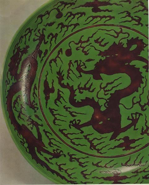 地を全体に緑色で埋めつくし、それに紫色相で竜と雲文に色を加えている。竜首の前の雲文は、おたまじゃくし様にかいているが、これは球を意味する。竜と雲はあらかじめ素地に図様を細刻しているので竜の鱗文などが釉の下に現われていて、粗中に細の趣きを現出している。素三彩と同じ技法である。高台裏は白地となり二重円圏内に「大清康煕年製」の染付の銘がある。出所:「清の官窯」