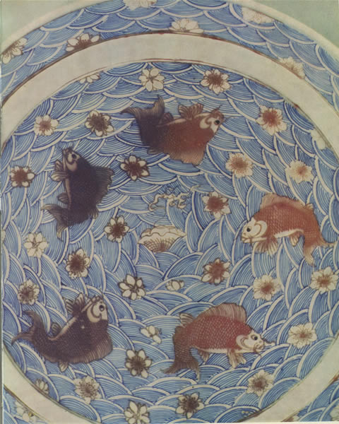 青花も釉裏紅も元時代に発明された釉楽で、この盤では波濤を青花(染付)とし、五匹の鯉と桃の花を釉裏紅としていて、桃花流水の意を表わしている。鯉は竜門をさかのぼる出世魚とされているので一種の吉祥文様である。銘は円圏内に「大清康煕年製」と二行にかいている。出所:「清の官窯」