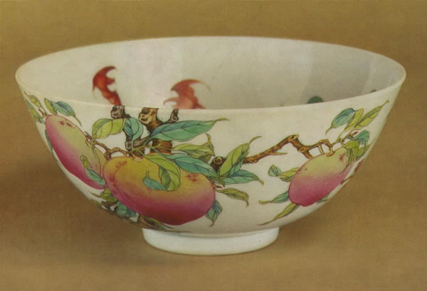 桃の実は長寿とか子孫繁栄とか古祥の意味がある。西王母の神話にまつわる果実なので、西王母を祭る廟にも蟠桃宮という名をつけている。この碗の桃は紅色を中心として黄色の未成熟の色をも加え写実的な画であるが、桃の実を大きくかいているので特に美しい。葉は表を青緑、裏を黄色にしている。銘は二重圏内に「大清雍正年製」と二行にかいてある。出所:「清の官窯」