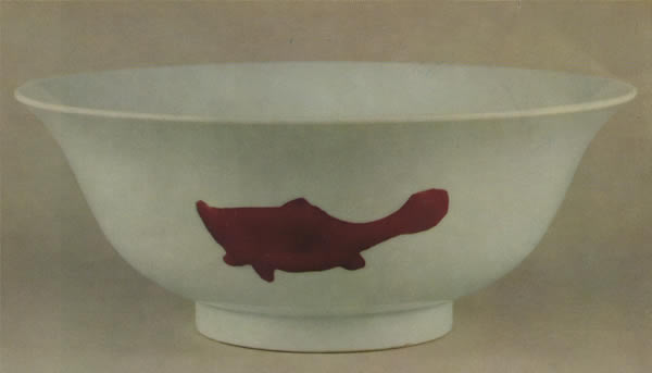 釉裏紅の色彩には浅紅と濃紅の濃淡まざった色合いのものがある。この手は明時代にもあるが、雍正時代にも名品が作られた。この鉢は白色の地に還元銅呈色の紫に近い濃紅で三匹の魚が描かれているが、一面には白い地に一魚しかでていないので美しさはまた格別である。銘は二重円圏内に「大清雍正年製」の二行銘がある。出所:「清の官窯」