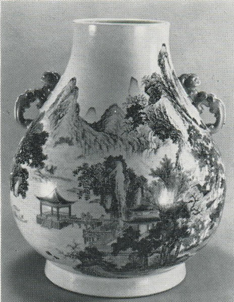 高さ44.3cm 梅沢記念館 雅人が湖中の水榭亭に遊ぶ図で、一幅の山水画を陶磁で表現したものである。五彩を用いているので院体画風になっている。耳は抹紅(朱色)釉としその上に金彩を施してある。このような大きな壺(尊ともいう)には百鹿図などもある。銘は「大清乾隆年製」と三行にかかれている。出所:「清の官窯」 関連用語: