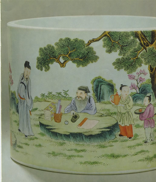 この小盤は琺瑯(洋彩)であるが、銘は金彩で「大清乾隆年製」とあり、他の「雍正年製」「乾隆年製」という料釉とも異なるので、一応粉彩としておく。小品ながら五彩で美しい蔬菜をかき、裏側は朱彩とし、その上に金彩で氷裂梅花をかいた豪華な作である。机上に置く飾り皿として作られたものてあろう。出所:「清の官窯」