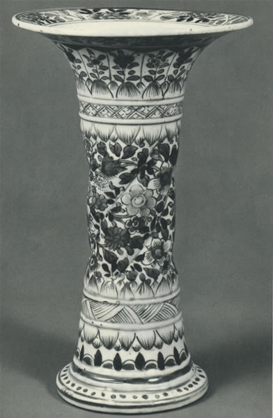 雅人が湖中の水榭亭に遊ぶ図で、一幅の山水画を陶磁で表現したものである。五彩を用いているので院体画風になっている。耳は抹紅(朱色)釉としその上に金彩を施してある。このような大きな壺(尊ともいう)には百鹿図などもある。銘は「大清乾隆年製」と三行にかかれている。出所:「清の官窯」