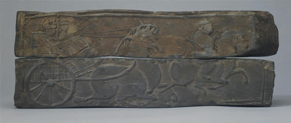 磚とは焼成した煉瓦のことで、それに図様を表したものを画像磚という。この磚は上下二枚で一つの絵柄をなし、二人の馭者が乗る馬車とその先導をとる騎馬人物が浮彫風に表されている。この二枚の情はそれぞれ別のルートで入手されたもので、これについて會津は「云わば兄弟の二枚が、一度発掘されてから長い間別々に流浪した末に、遂に私の家の食堂のテーブルの上でめぐり合ったものらしい。奇遇と云うべきであろう」と述べている。 参考資料:『早稲田大学会津-八一記念博物館会館記念名品図録2007』