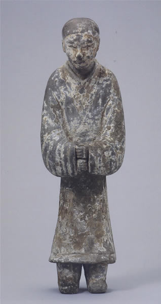仕女が、ゆったりと長衣をまとい、袴をはいて立つ姿を表している。頭部は小さく、長身で、やや背を丸めて前かがみに立ち、腹前で両手の拳を重ねている。両拳には筒状に孔があいており、何かを持っていたと思われる。頭髪は後ろで束ね、毛先を結い目に巻きつけて髻を作り墨色を施す。型抜の技法によって作られ、顔と手には肌色、着衣には朱色の痕跡をとどめる。