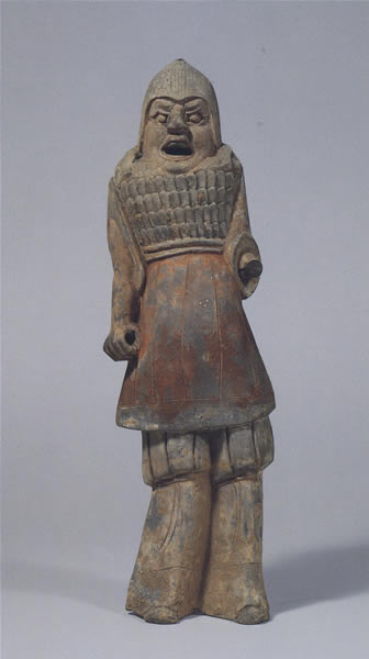 鎧と兜に身を固め、憤怒の形相を表す武人俑である。眉根を寄せ、眼は眼球が飛び出さんばかりに大きく見開き、口を開けて怒気を漲らせる。首をすくめて肩をいからせ、上体をやや右に捻った姿勢で立つ。右腕は体側に沿って垂下し、左腕は肘を前方に曲げ、肘先をついでいたが、現在は欠失している。体躯は偏平で背面の表現が省略されているが、こうした表現は南北朝時代の仏像にも共通する特色である。