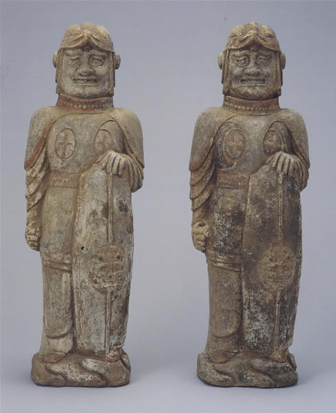 兜をかぶり、鎧を着けて楯を持った一組の武人俑。面貌は角張り、体躯は太くて詰まっており、がっしりとした強靭さを漂わせる。左腕は、肘を前方に曲げ、獣面の付いた楯を支え持つ。右腕は体側に沿って垂下しているが、当初は武器を執っていたらしく拳には孔が穿たれている。共に型板の技法を用いているが、頭部と体節は別々に作られている。この二体は同じ型を使用して作られたと思われる。