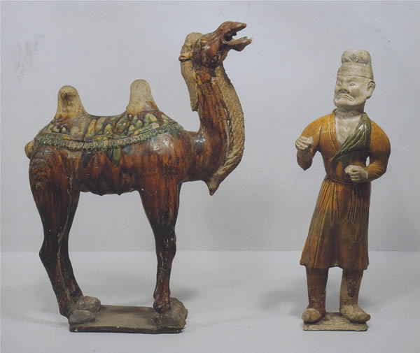 首をあげて嘶く駱駝を、胡人風の駝丁が操る様を表している。駱駝は双瘤で、頸の毛は正中線の左右方向に斜線状に整えられ、背にはレース付きの褥をかける。駝丁は、つり上がった小さな眼、上を向いた大きな鼻、高い頬骨、角張った顎など容貌魁偉な胡人の特徴をもっている。幞頭をかぶり、膝まで達する長い袍を着し、その下には細い袴をつけている。駝丁の肉身部と駱駝の瘤は胎土を残し、そのほかは釉薬をかけている。