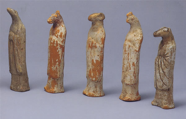 直立し、袍をまとって手する人身獣頭の十二支神俑である。これらの俑は本来、鼠、牛、虎、兎、龍、蛇、馬、羊、猿、鶏、犬、猪の計十二体を一揃いに作ったもので、それぞれ対応する各方位に配置して副葬し、方位の守りとしていた。本作例は現在、鼠、猿、猪の三体を欠いた九体となっている。いずれも細身で、広袖の袍をゆったりと着て佇立し、一種神秘的なたたずまいを見せている。頭から体までを前後の合わせ型で成形している。