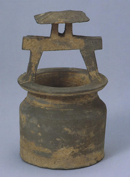 丸い井筒に滑車台をつけた陶製の井戸である。滑車台は、井筒の口縁部に二本の柱を立てて梁を渡し、さらにその上に二本の小柱を立てて屋根を架したものである。滑車は小柱の間に取り付けられていたが、現在は欠失している。明器の井戸が副葬されるのは、墓主が死後の生活においても水に不自由しないための配慮であろう。