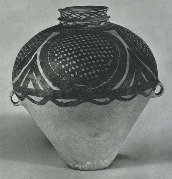馬家窯 高48cm 口径15cm 陶 1956年甘粛省永靖出土 甘粛省博物館蔵 容器。泥質紅陶。頸部に堆文がめぐらされ,腹部の両側に耳がある。頸部に黒色の網文,上腹に黒色と褐色の円輪が四つ,その中に黒白交互の方格編織文が描かれている。出所:『中華人民共和国出土文物展1977』 関連用語: