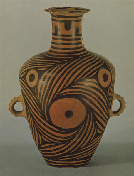 この両耳壺は水を入れるもの。泥質紅陶。長頸は手で持ちやすく,腹部の両耳は,繩を結んで水を汲んだり,傾けて注ぐのに便利にできている。古代の陶工の知恵がみられる。装飾図案の旋渦文は原始社会の黄河流域の人々が奔騰する急流を芸術的に表現したもの。優美な造形,流れるような線條は工芸のきわめて高い完成度を示している。出所:『中華人民共和国出土文物展1977』