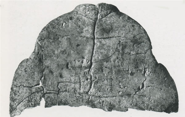 表面に刻辞八組56字。内容は商(殷)王武丁が祖乙,父甲らを祭祀するト辞を記載する。商(殷)王は大事のあるごとに卜占した。 卜占の材料は主として亀の背甲,腹甲,牛の肩胛骨である。 トいに際しては,甲骨の一面にまず細長い凹みをつけ,そこに円い穴を刻む。次に,その刻みこんだ個所を火で焼くと,骨の裏面に熱によって様々な卜形の亀裂が生じる。この亀裂を「ト兆」という。 ト人は「ト兆」の形に基づいて吉凶を判断し,ト問の経過と結果を甲骨の上に文字で刻みつけた。この文字を「甲骨文」と呼ぶ。現在のところ,5,000種以上の文字が発見されており,商(殷)代の歴史,文化研究の重要な史料となっている。出所:『中華人民共和国出土文物展1977』