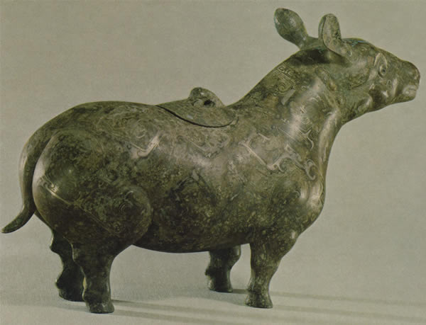 酒器。獣は首をもたげ,耳を立て,目を見開き,ロをかすかに開いている。全身に金銀象嵌の雲文が施され,頭,尾,蓋の表面には緑松石,眉には金がそれぞれ象嵌されている。獣口が注ぎ口となっている。頸部には首輪が鋳だされている。器口は背にあり,鴨形の蓋は鐶で本体とつながり,開閉できる。出所:『中華人民共和国出土文物展1977』