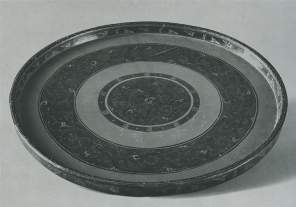 前漢 高4.5cm 直径52cm 木・漆 1973年湘南省長沙馬王堆三号墓出土 湘南省博物館蔵 盛食物器。木胎。盤内には朱と黒の漆が塗られ雲文の図案が描かれている。外底に朱漆で「軑侯家」の3字が書かれている。出所:『中華人民共和国出土文物展1977』 関連用語: