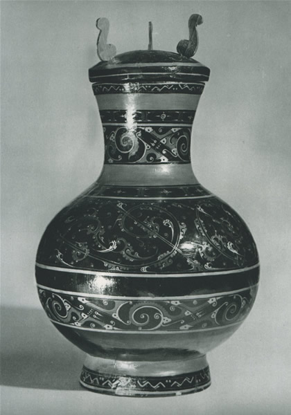 盛酒器。木胎。蓋ははめ込み式になっており,上に三つのつまみがついている。内壁は紅漆,外表は黒漆が塗られている。口縁に朱の波折文,頸の上部に淡黄色の雲文を一条,下部に朱と緑色の雲文を一条,肩部に朱色の雲文を一条,上腹と下腹には朱と緑色の雲文がそれぞれ描かれている。