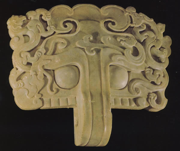この青玉駄面文玉鋪首は,一つの青玉を彫りあげたもの。目を見開き鼻を巻き,牙をむきだしたその獣面には,さらに四方を象徴する青龍,白虎,朱雀,玄武の姿が彫られている。重厚な形のうえに精緻で美しい彫りである。背面には突きでた長方形の鼻形のつまみがあり,上の孔から鐶が通せる。前漢武帝の茂陵地下建築大門の装飾品であろう。これほど大型の漢代彫玉は今までに発見されていない。出所:『中華人民共和国出土文物展1977』