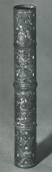 前漢墓出土のこの筒形金具はおそらく車飾で,四つの節に分けられた竹管状をしている。全体に金銀で狩猟文が象嵌され,緑松石(トルコ石)も象嵌されている。雲気に包まれた山と花樹の中に,一番目の節には象の背に乗る3人の人物のほかに,羽人,龍,馬,熊,兎,鹿,鶴,魚,亀,二番目の節には馬にまたがり後ろ向きに虎を射る狩人のほかに,熊,鹿,狼,猿,山羊,野猪,鳥,三番目の節には駱駝の背にまたがる人物のほかに,羽人,熊,虎,鹿,鶴,四番目の節には尾羽を広げ鳴く孔雀と羽人,熊,虎,のろじか,雁,鶴などがそれぞれ見られる。出所:『中華人民共和国出土文物展1977』