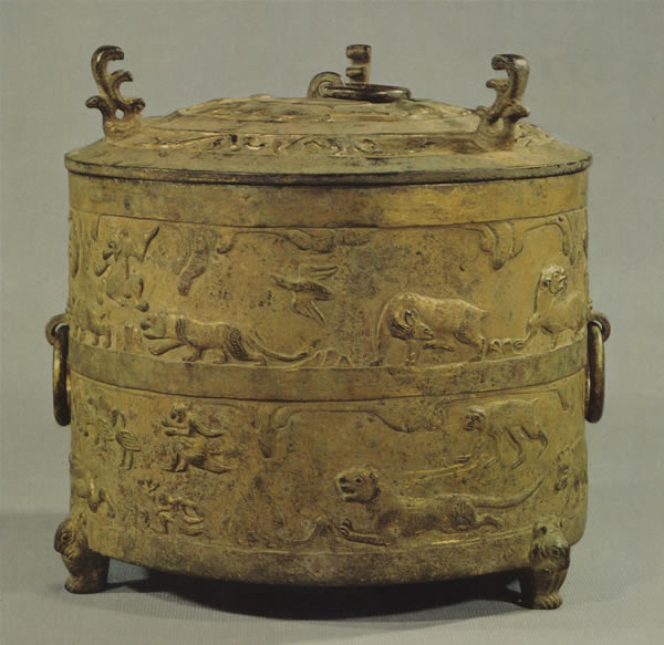 右玉大川村の前漢地下倉出土の9点の青銅器のうち,鍍金温酒樽2点がひとしく刻銘と鳥獣文様をもつ。展示の温酒樽は表面が鍍金され,底部に熊形の足が3本,器腹に鐶のつり手が一対ついている。器の内側は漆塗りで,器身と蓋には浮彫りの連山鳥獣文様が鋳だされ,蓋の内側には菱鳳雲文が漆で描かれている。蓋と器身の口縁部には「中陵胡傅銅温酒樽,重廿四斤,河平三年造,二」の銘文が刻まれている。『漢書』地理志によると,中陵県は雁門郡に属し,今の山西省右玉県である。過去においてこの種の温酒樽を銅れんと誤認する者があったが,この銘文でそれが訂正された。酒樽の重さ6,100グラムを24斤で換算すると,漢代の一斤は254グラムに相当することがわかる。河平3年は前26年である。出所:『中華人民共和国出土文物展1977』