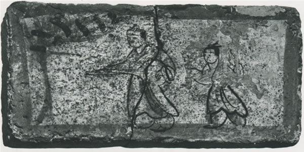 魏 長35.8cm 幅16.8cm 厚4.5cm 陶・加彩 1972年甘粛省嘉峪関出土 嘉峪関市文物保管所蔵 四号墓の前室面壁北側にあったもの。樹下で演奏する二人の人物を描く。前者は琵琶を弾き後者は手拍子をとりながら歌を歌っている。この塼の模写は1975年に日本で公開された。出所:『中華人民共和国出土文物展1977』出所:「清の官窯」 関連用語: