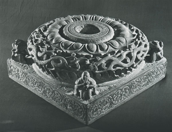 この石彫は,上部が鼓形で,浮彫りの蓮弁文,龍虎文をめぐらナ。台座は正方形で,四隅に丸彫の伎楽人物が飾られている。童子が太鼓を打ち,簫を吹き,琴を弾き,舞う姿で,その表現は生気にあふれている。