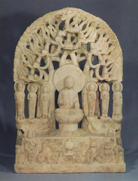 北斉(550-577年)時代の石仏像。釈迦牟尼が菩提樹の下の蓮座の上で説法する姿が彫刻されている。左右には各々3人の合掌侍立する弟子たち,台座の中央には香炉を捧げ持つ2人の童子,その左右には2匹の獅子と2人の力士をあらわす。もと金を塗られていたが,現在は剥落している。出所:『中華人民共和国出土文物展1977』