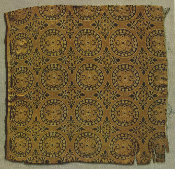 この黄地連珠草花文経錦の文様は連珠で小団花をつくり,それが経斜文を形づくっている。よく見られる唐錦である。出所:『中華人民共和国出土文物展1977』