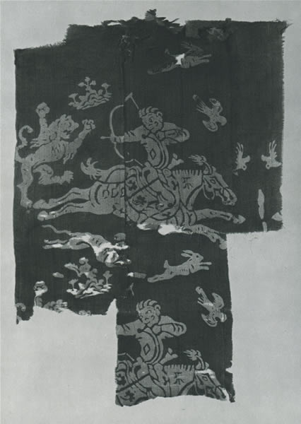 吐魯番の唐墓からは多くの捺染織物が出土し,絹織物の捺染工芸研究の重要資料となっている。この平織りの上の茶色狩猟文は,型を置いてから染料を塗り染めだしたものである。その地色と文様の色からみて,三回に分けて染色したものと思われる。出所:『中華人民共和国出土文物展1977』