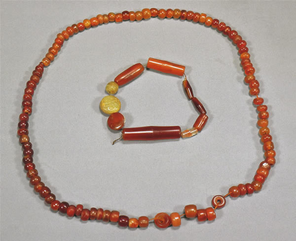 本品は103個の瑪瑙とふたつの玉でできている。瑪瑙は石英の結晶で、美しい光沢としま模様がある宝石である。いろいろな形に加工されており、ほとんどが紅色だが、浅紅色のものもいくつかある。透明であったり半透明であったりで、それぞれ異なる美しさがある。形状が馬の脳に似ていることから、もともと馬脳と呼ばれ、それが瑪瑙となったようである。首飾りとも考えられるが、古い墓から出土した人形によれば、腰の帯にぶら下げていた可能性が高い。出所:「大兵馬俑展」