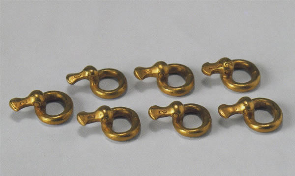 秦人の場合、君主や貴族は金の帯鉤や玉の帯鉤を用い、平民は銅の帯鉤を使っていたようで、秦においては帯鉤が身分を示していたようである。兵馬俑の兵士たちの帯鉤はおそらく青銅製だったのだろう。益門村からは金の帯鉤が発見されている。ということは、ここにはかなり身分の高い人物が埋葬されていたことが予想できる。兵高俑の兵士たちが着用している帯鉤は16種類ある。長いもので20cm、短いもので3~4cmあり、兵士たちも個性的なバックルを着用することでささやかなおしゃれを楽しんでいたようである。出所:「大兵馬俑展」