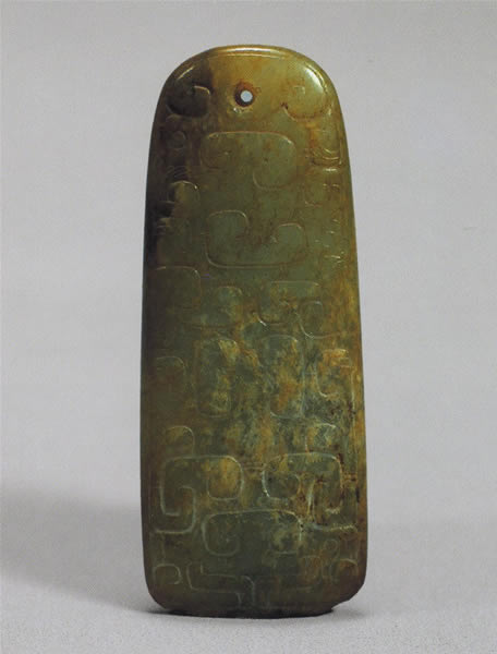 〈斧の形をした玉の飾り〉 春秋秦 玉製 長さ6cm 幅2.2cm 中間の厚さ0.5cm 1992年陝西省宝鶏市益門村 宝鶏市考古工作隊 斧をかたどってつくられたまるみをおびた飾りで、一方に穴があいており、そこに紐などを通して使用された。両面にそれぞれ異なる細かい紋様がほどこされており、裏表ともに利用できる飾りであった。出所:「大兵馬俑展」 関連用語: