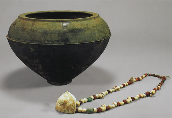 陶灶の上に載せて穀物や魚・肉などを煮炊きしたり、甑と合わせて蒸し物に使うといった調理に使用された器。別の場所からは魚骨の残骸が一緒に入った釜が出土している。内部からトルコ石・紅瑪瑙・貝殻など107点が発見された。紐を通す穴が開いていたことから、これらはおそらく紐を通してつなげた飾り物として使用されていたのだろう。炊具であるはずの釜の中からどうしてこのような装飾品が出土したのかは不明である。出所:「大兵馬俑展」