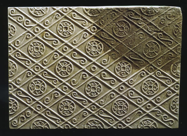 秦の宮殿建築の床に敷きつめられていたものである。斜めの線を組み合わせたひし形紋の中に、二重の円と柿の蔕とをあしらった太陽紋、円形紋、S字紋がほどこされている。出所:「大兵馬俑展」