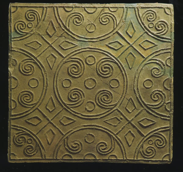 〈模様の入った正方形のレンガ〉 秦 陶製 一辺39cm 陝西省咸陽市咸陽宮殿遺跡 陝西省考古研究所 太陽紋花紋磚と同様に宮殿に敷きつめられたものである。斜めの線と円とを組み合わせ、円の中には雲紋をあしらっている。書紋は秦の瓦当にもよく使われた紋様である。敷きつめると、図のように連続して紋様が浮かびあがる。出所:「大兵馬俑展」 関連用語: