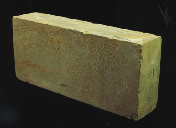 兵馬俑坑の床全面に敷きつめられていたレンガである。レンガは細かい縄目の紋様で飾られており、石のように堅い。側面に押されてあるスタンプは、製作者の名前をあらわしている。大きさは、これを最も大きいものとして3種類あり、大小組み合わせて敷いた。土台に乗せられた兵馬俑たちはこのレンガの上に並べられている。出所:「大兵馬俑展」