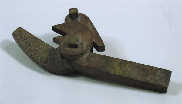 弩の機械じかけの部分である 。部品は望山(照準)、懸刀(ひきがね)、牙(弦がけ)、鍵(懸刀と牙の止め金)の4部分に分けられる。弩は戦国時代には盛んに使用されるようになり、明代に火器が出現するまで、最も強力な武器として重要な役割を果たした。また、弩とは怒の意味に通じ、その威力の強さを表した。出所:「大兵馬俑展」