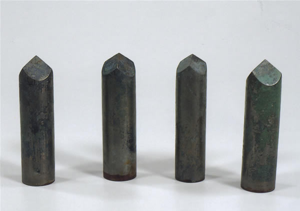 殳(つえぼこ)は、五兵(戦車上で使われた武器=戈・矛・殳・鉞・弓)のひとつで、敵兵を突き倒すなど実戦用のほか、護衛兵の装備として、儀杖用(儀式の際に用いる刃のついていない武器)としても使用された。中は空洞であり、下から木製の柄を装着した。三号坑からは64体の護衛兵と31件の殳か出土している。出所:「大兵馬俑展」
