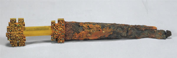 柄の部分は金製であり、刀身の部分は金・鉄製である。鍔の部分には獣面が施され、トルコ石で獣の目を表現した。出土時、刀身に織物の痕跡があり、剣はそれに包まれていたと考えられている。古代の貴族や将校・兵士は身に帯びる剣によって、位や身分を顕示した。青銅製武器が一般的であった当時、この剣の持ち主の高い地位を知ることができる。出所:「大兵馬俑展」
