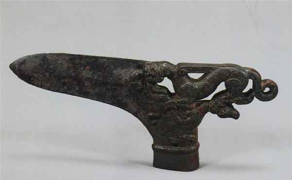 この戈には、虎が鷹をつかみ取る図柄が透かし彫りにされている。虎と猛鳥の組み合わせは、山西省太原市金勝村出土の「鳥蓋銅瓠壺」(鳥形のふたのついたヒョウタン形の銅壺)などにも見られ、猛獣の争うモチーフは、北方騎馬民出土の器物や装飾品に好んで用いられている。こうした表現は、戦場での勇ましい活躍を期待したものだろうか。