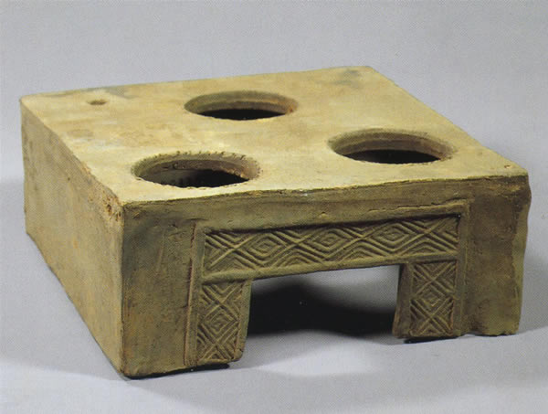 炊事でつかうかまどをかたどって作られた明器。上部の3つの穴に釜をおいて調理した。こういったかまどは古代から現在に至るまで中国の農村で多くみられるタイプである。当時の燃料は木材で、石炭ほどの強い火力はなく、スープや蒸しものが主な食べ物であった。今私たちが食べるような炒め物を中心とする中華料理が一般的になったのは宋代以後(紀元後1000年前後)のことである。出所:「大兵馬俑展」