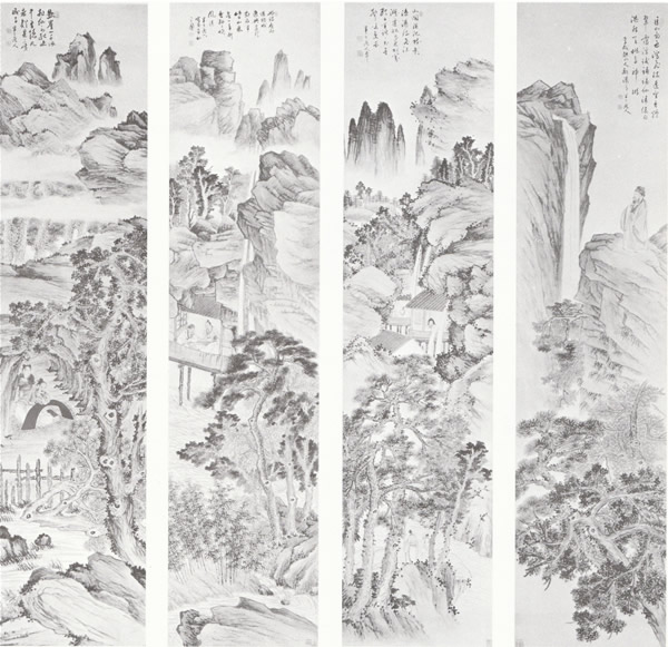 陳半丁作 この四枚の山水画は〝筧句〝(あれこれと適当な句を考える)〝対〝(対局する)〝聴泉〝、、(泉の湧くのをきく)〝観瀑、(滝を見る)の各々の情景の絵です。陳半丁の山水、人物画の芸術の成果を見ることができます。出所:「中国栄寶斎展覧」 関連用語: