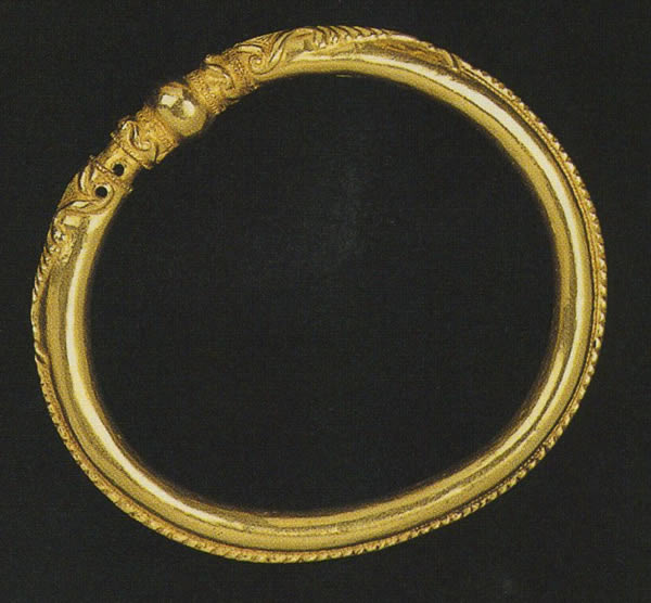 二つの端末はほとんど同一のように見えるが、入念さに違いが認められる。疎略な方は師の仕事を手本とした弟子の作品とも考えられる。本体をなす輪の部分は、内部が空洞で断面は三方向に放射する星の形をした金板からできており、それを基軸の周りに八回ねじり、輪の形に曲げ、両端を溶着している。出所:「古代ヨーロッパの至宝--ゲルト美術展1998」