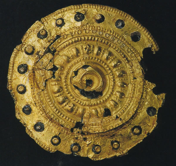 装怖面は金製で、内側の円盤とそれを取り巻く環状部分とからなる。中心の珊瑚の粒の周りに同心円状に円文と連珠文を打ち出し、その周囲に20粒の珊瑚を釘で留めていた。裏面には薄い鉄の円板に鉄の留め針と針受けを取り付け、渦巻の軸にはブロンズを使っている。出所:「古代ヨーロッパの至宝--ゲルト美術展1998」