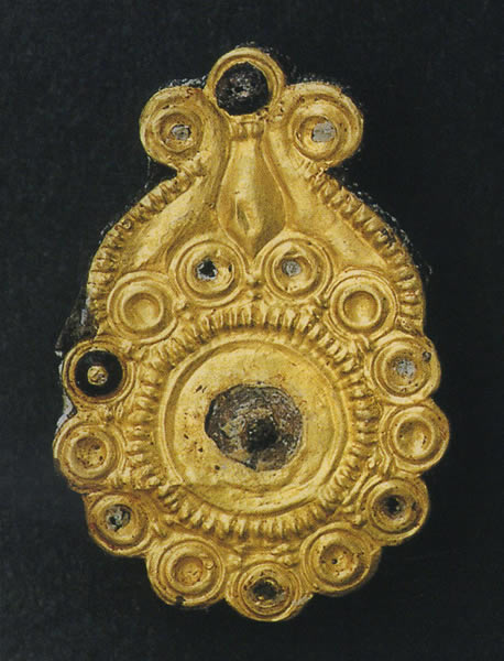 円盤からパルメットが立ち上がる形である他は、装飾・技術とも"円盤状フイブラ"に同じ。出所:「古代ヨーロッパの至宝--ゲルト美術展1998」