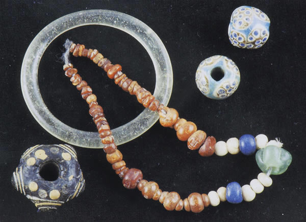 (a)は褐色がかった黒の地に、白と黄色の同心円を伴うこぶを五つ付け、二つの紐穴の両側に黄色と白の粒をあしらう。(b),(c)は青緑の地に、褐色・白・青からなる七曜文を六つあしらう。クンターによれば、いずれも制作地はイタリア、カノレタゴ、またはおそらくエジプトである。出所:「古代ヨーロッパの至宝--ゲルト美術展1998」
