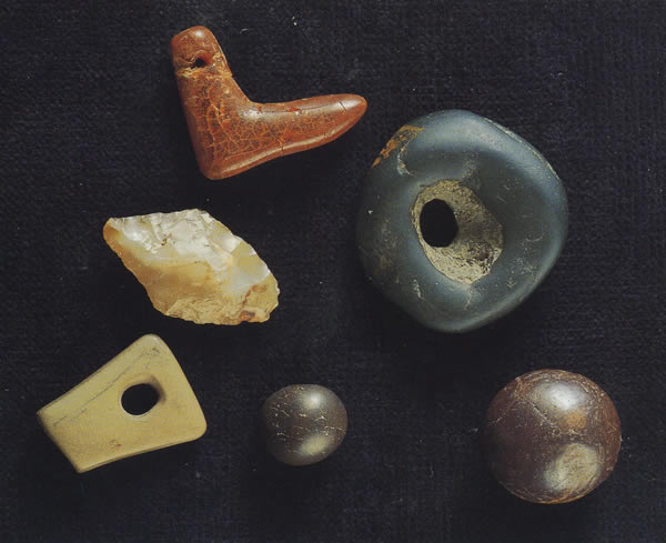 蜂蜜色の火打ち石を使った新石器時代の矢じり(長さ3.22cm)。緑灰色の石による台形のペンダント(長さ2.54cm)。褐色の碧玉による玉(径2.35cm)。暗褐色の石による小玉(径1.5cm)。琥珀による足形ペンダント(長さ3.01cm)。五つの琥珀を寄せ集めたもの(長さ8.8cm)。出所:「古代ヨーロッパの至宝--ゲルト美術展1998」